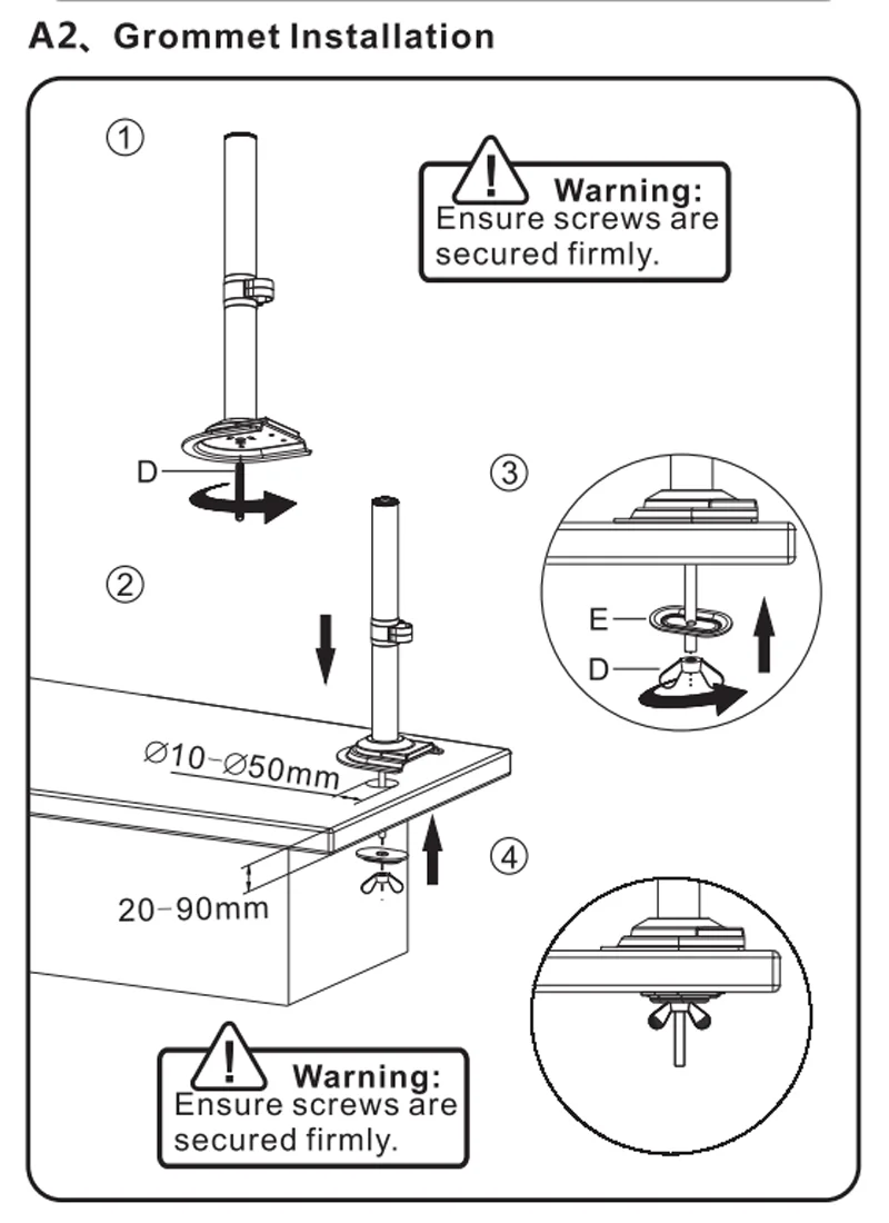 Base de ilhó adequada para diâmetro do furo 10mm-50mm, espessura da mesa: 20-90mm (se a espessura da sua mesa for entre 80mm-120mm,por favor escolha a opção correta aqui)